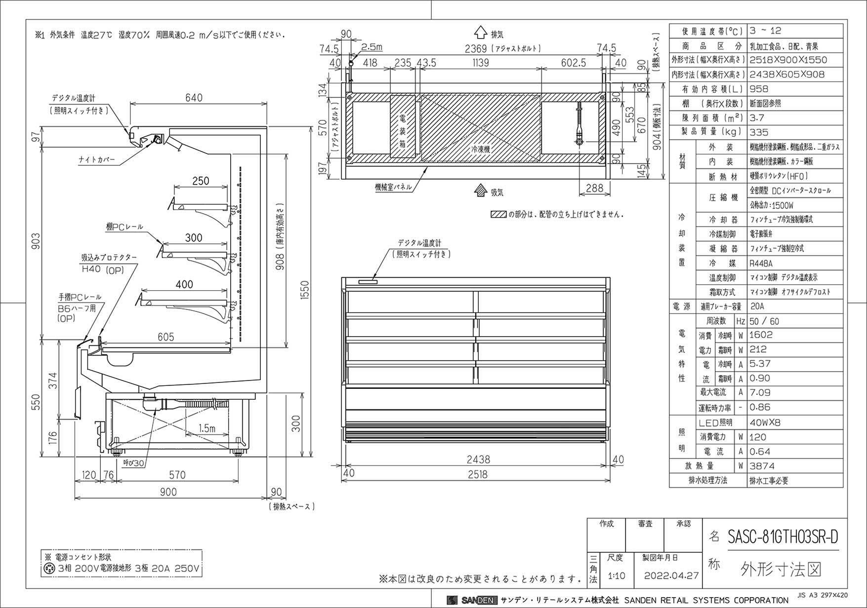サンデン 冷蔵ショーケース セミ多段タイプ SASC-81GTHO3S-D(旧SHMC-85GHTO3S-D) 幅2518×奥行910×高さ1550mm