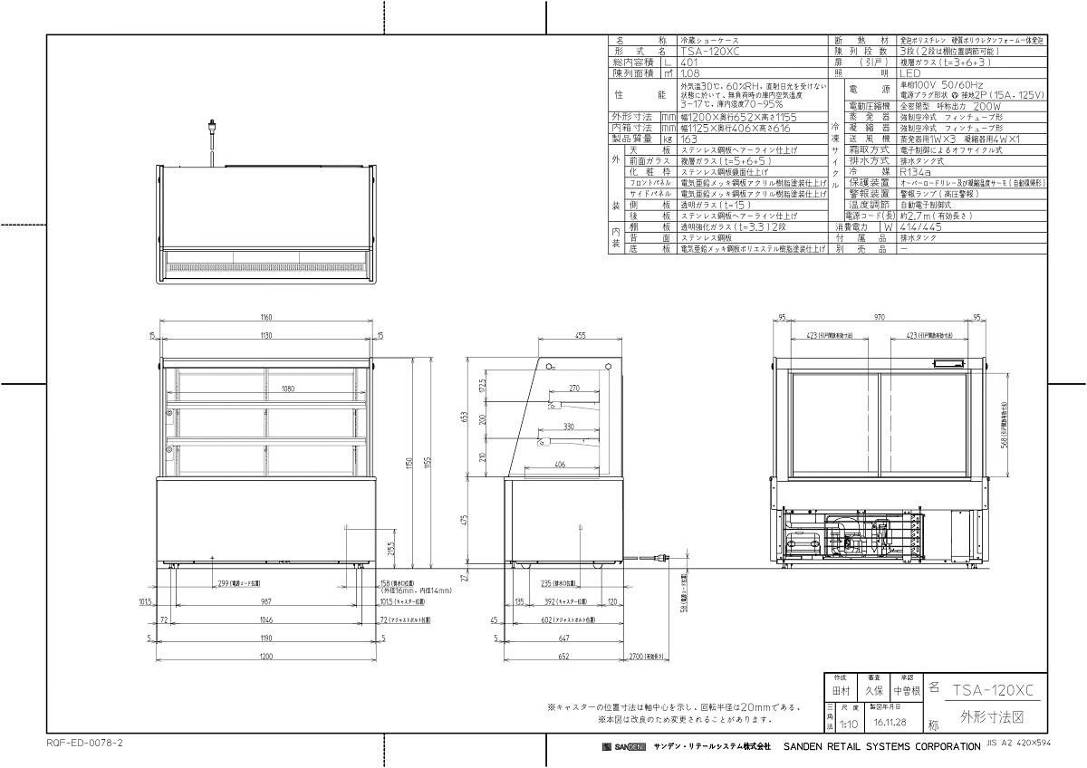 サンデン 冷蔵ショーケース 対面タイプ TSA-120XC1(旧型式:TSA-120X) 幅1200×奥行652×高さ1155mm