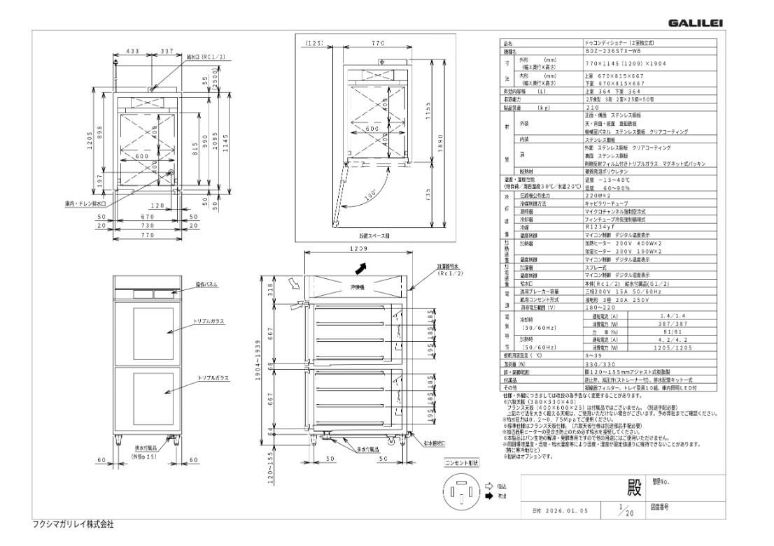 BDZ-236STX-WB【フクシマガリレイ】ベーカリー機器(2室ドゥコンディショナー:36枚差しW770タイプ 食パン用) 幅770×奥行1145×高さ1904mm
