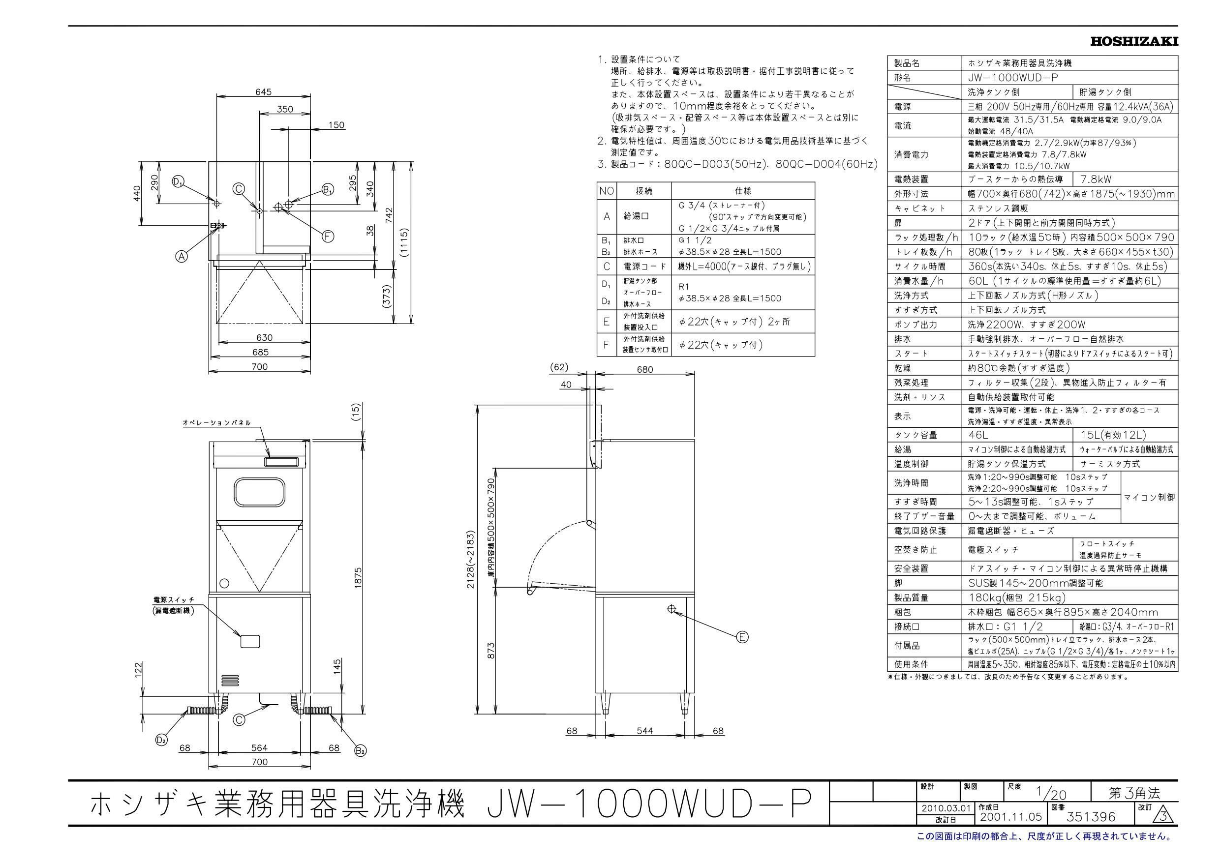 商品名:器具洗浄機 JWE-1000WUC 700×680×1875(mm) 三相200V