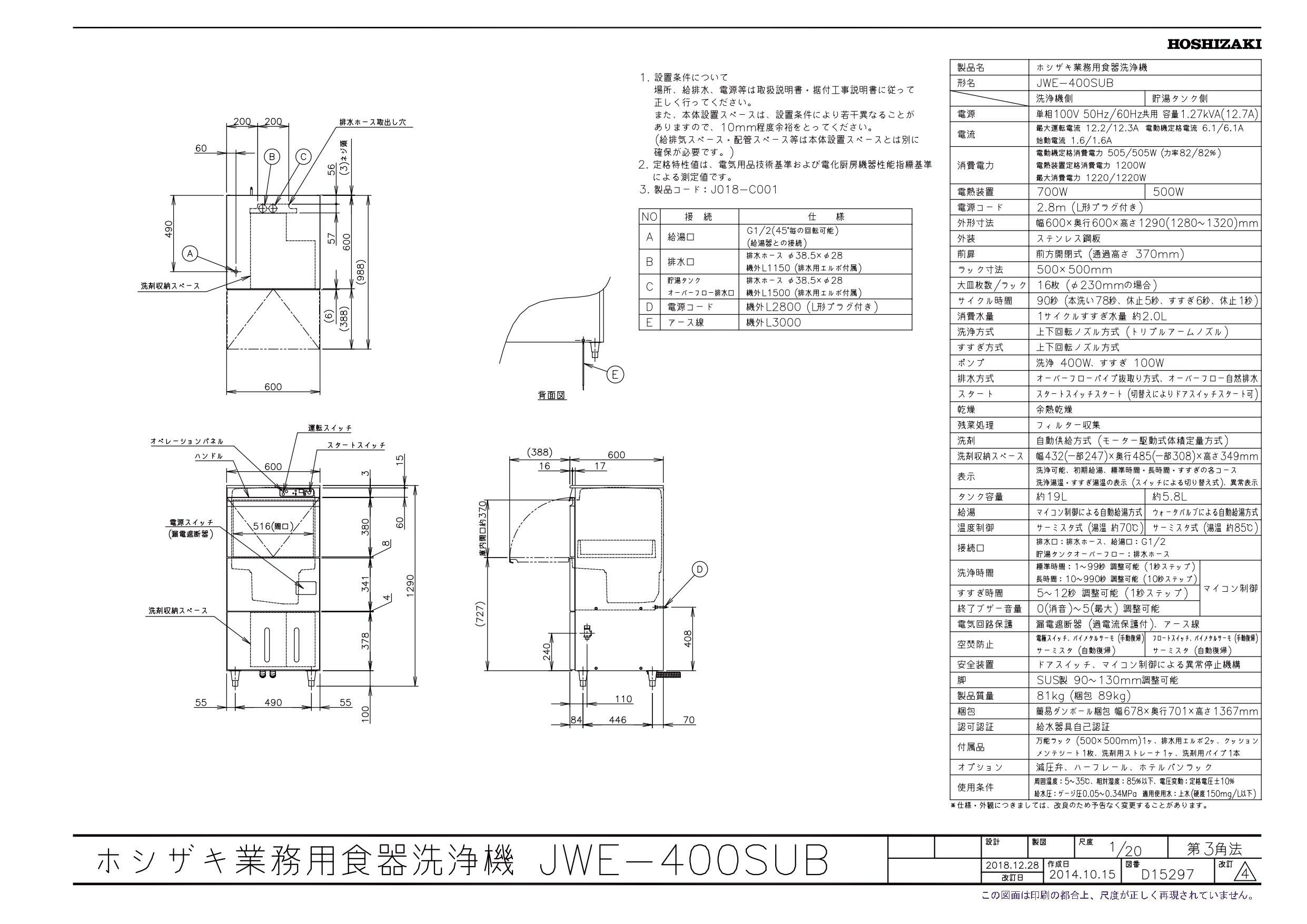 商品名:食器洗浄機(小形ドアタイプ) JWE-400SUB 600×600×1290(mm) 単相100V