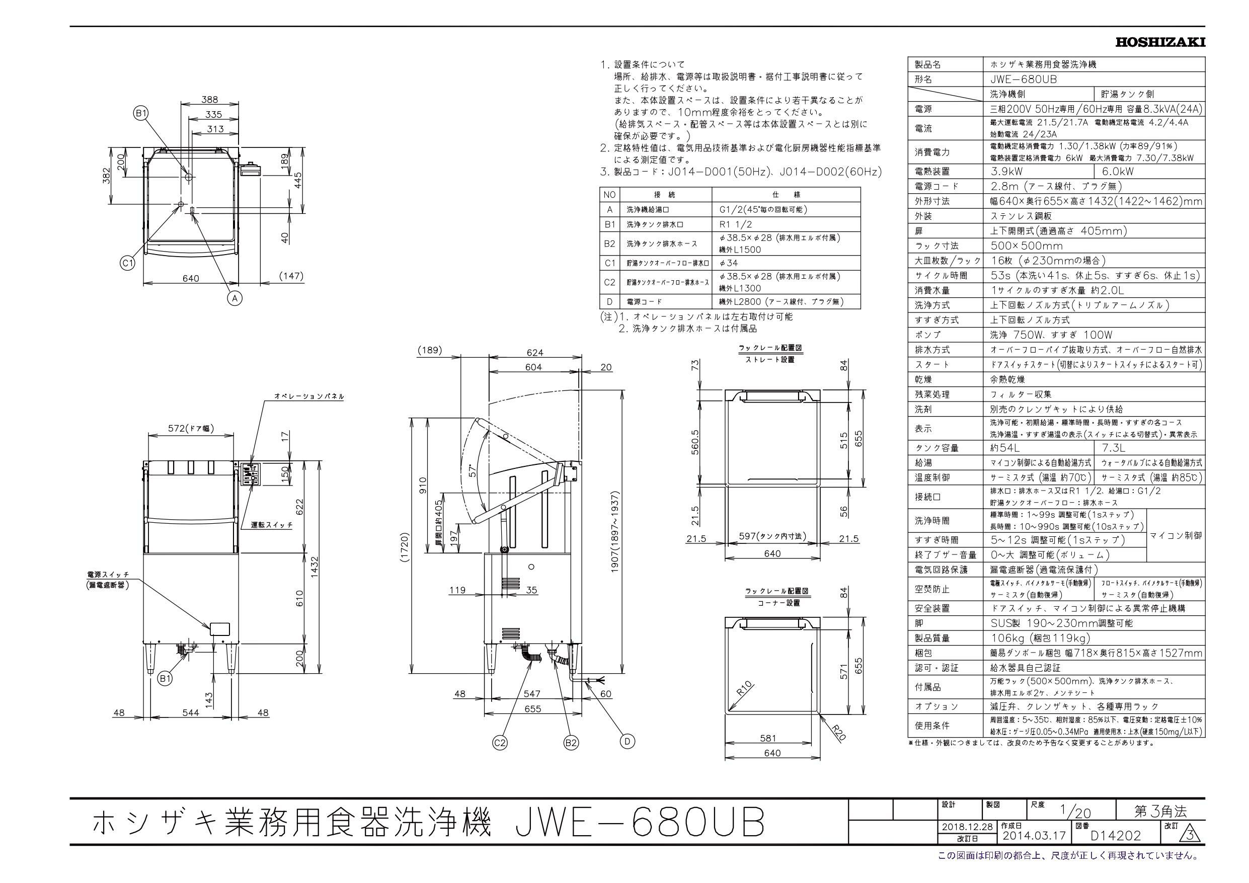 JWE-680C(旧JWE-680UB)【ホシザキ】食器洗浄機(ドアタイプ) 640×655×1432mm 三相200V