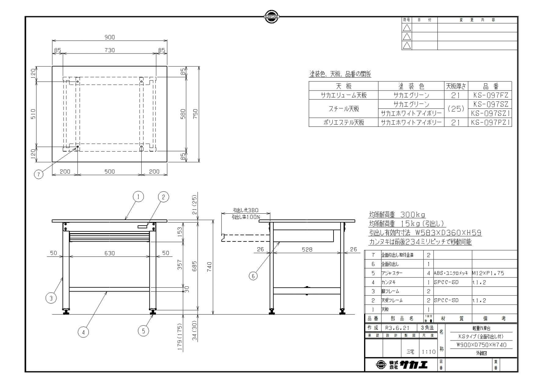 商品名:軽量作業台KSタイプ(全面引出し付) KS-097SZ