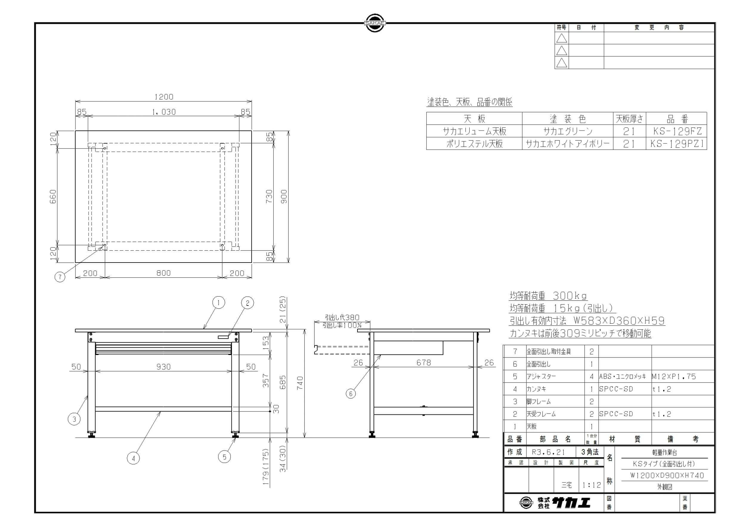 商品名:軽量作業台KSタイプ(全面引出し付) KS-129PZI