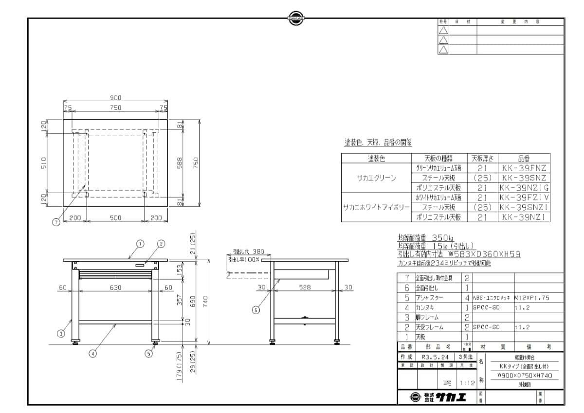KK-39FNZ 【サカエ】軽量作業台KKタイプ(全面引出し付) 幅900×奥行750×高さ740mm