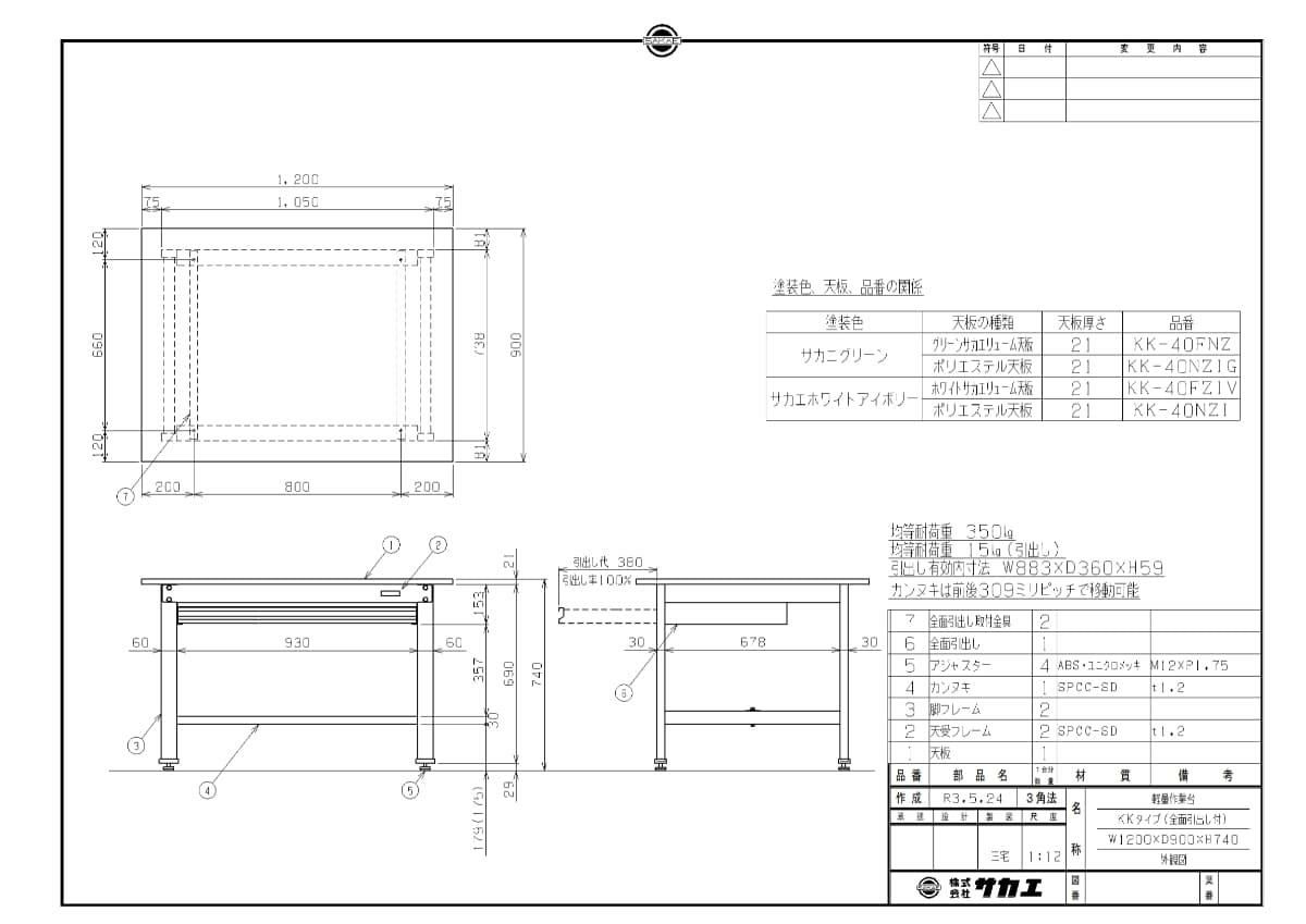 KK-40FZIV 【サカエ】軽量作業台KKタイプ(全面引出し付) 幅1200×奥行900×高さ740mm