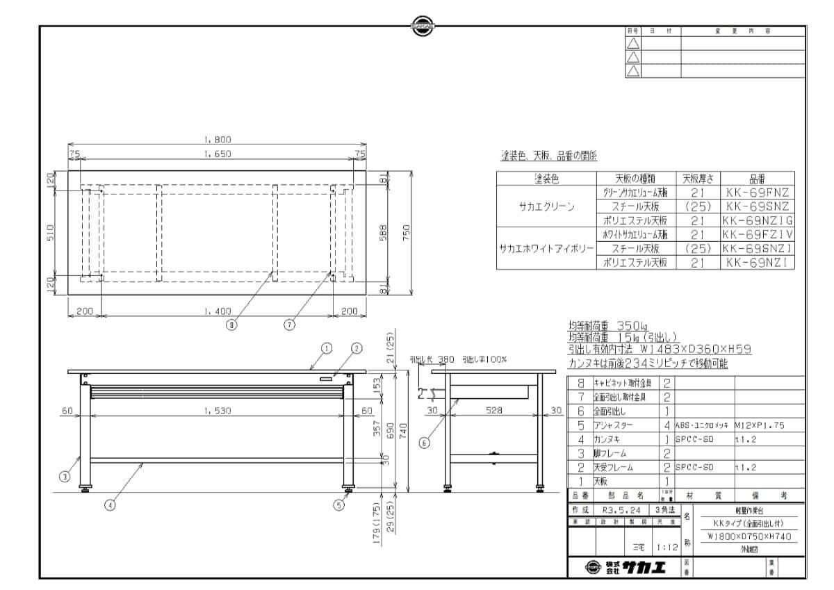 KK-69SNZ 【サカエ】軽量作業台KKタイプ(全面引出し付) 幅1800×奥行750×高さ740mm