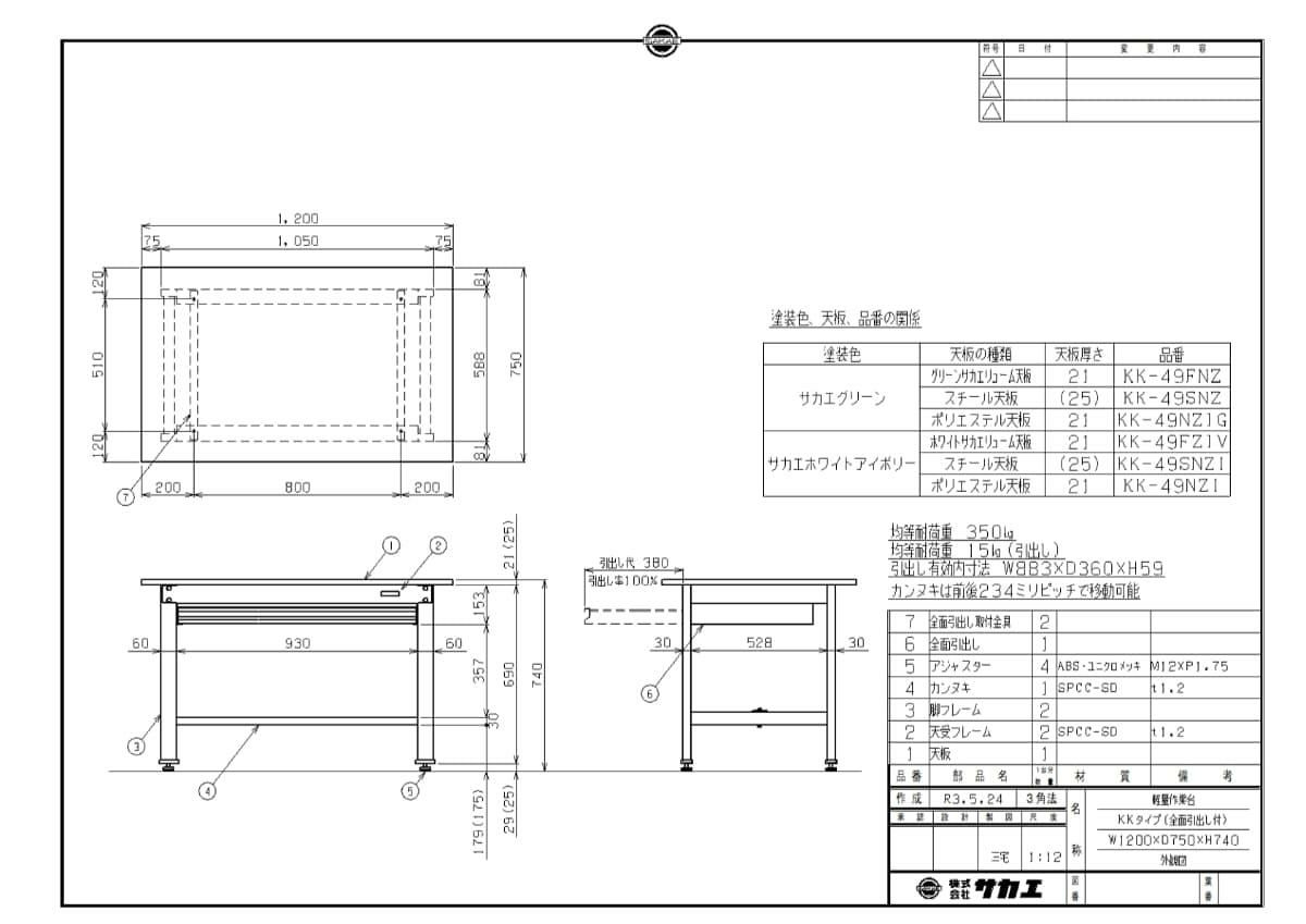 KK-49SNZI 【サカエ】軽量作業台KKタイプ(全面引出し付) 幅1200×奥行750×高さ740mm
