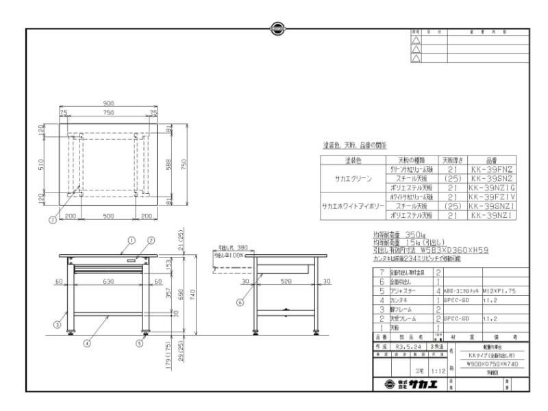 KK-39NZIG 【サカエ】【固定式】軽量作業台KKタイプ(全面引出し付) 幅900×奥行750×高さ740mm