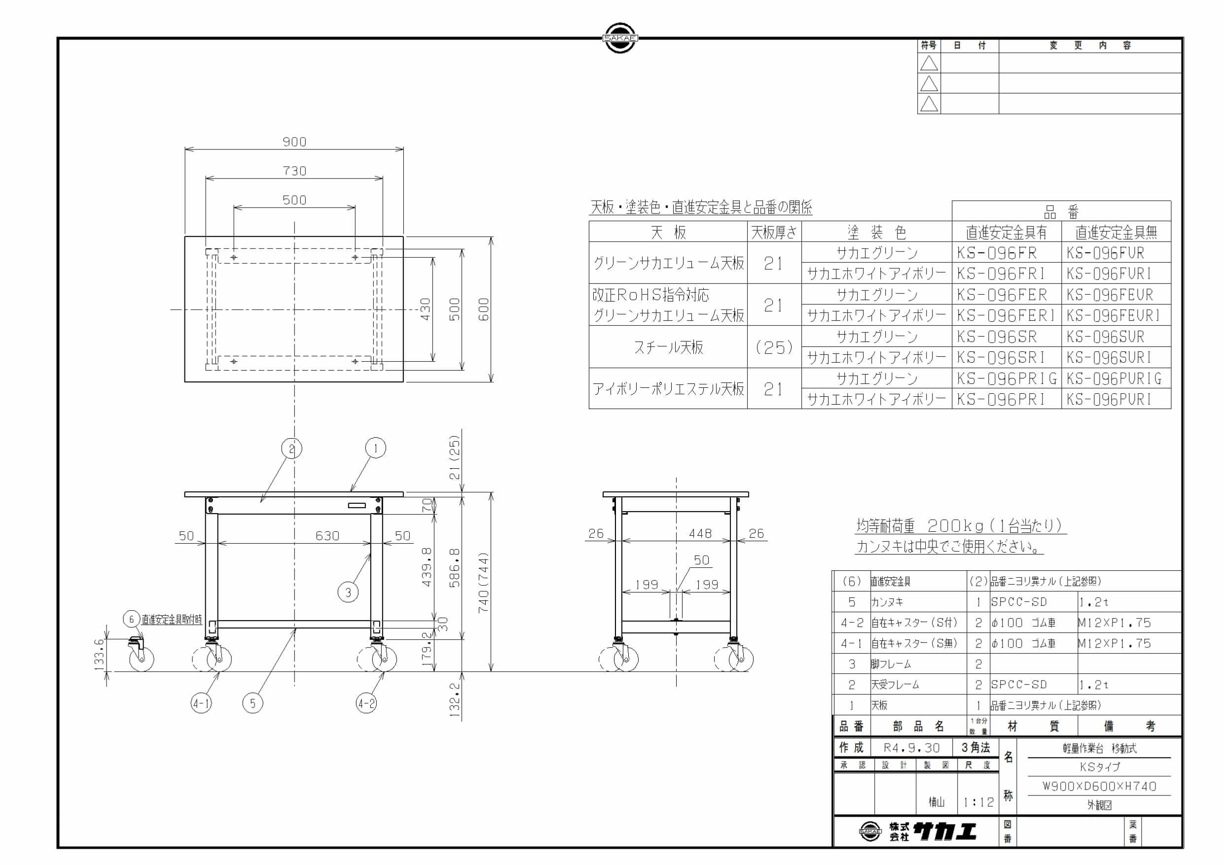 【移動式】【サカエ】軽量作業台KSタイプ(移動式) KS-096SRI 幅W900×奥行D600×高さH740mm