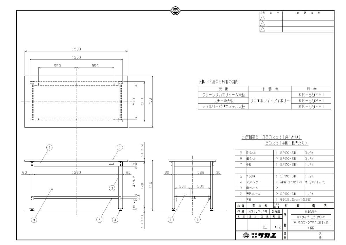 KK-59SPI 【サカエ】【固定式】軽量作業台KKタイプ(三方パネル付) 幅1500×奥行750×高さ740mm