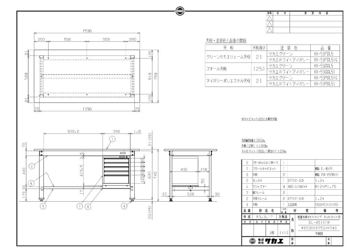 KK-59FSL5 【サカエ】【固定式】軽量作業台KKタイプ(スモールキャビネット付) 幅1500×奥行750×高さ740mm