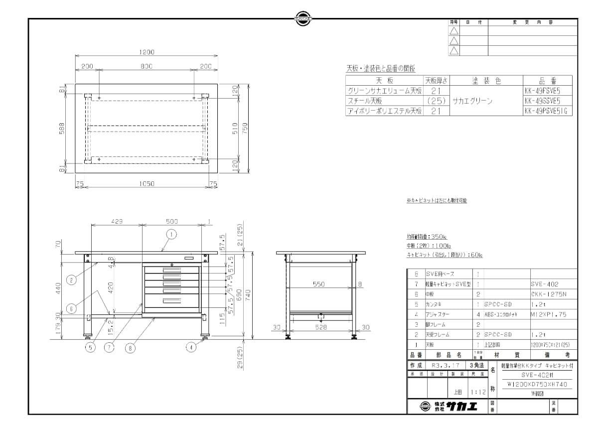 KK-49FSVE5 【サカエ】【固定式】軽量作業台KKタイプ(SVEキャビネット付) 幅1200×奥行750×高さ740mm