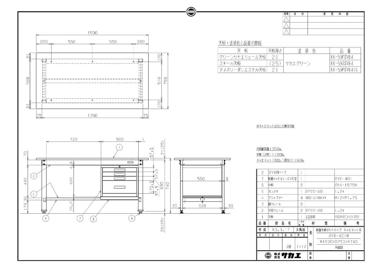 KK-59FSVE4 【サカエ】【固定式】軽量作業台KKタイプ(SVEキャビネット付) 幅1500×奥行750×高さ740mm