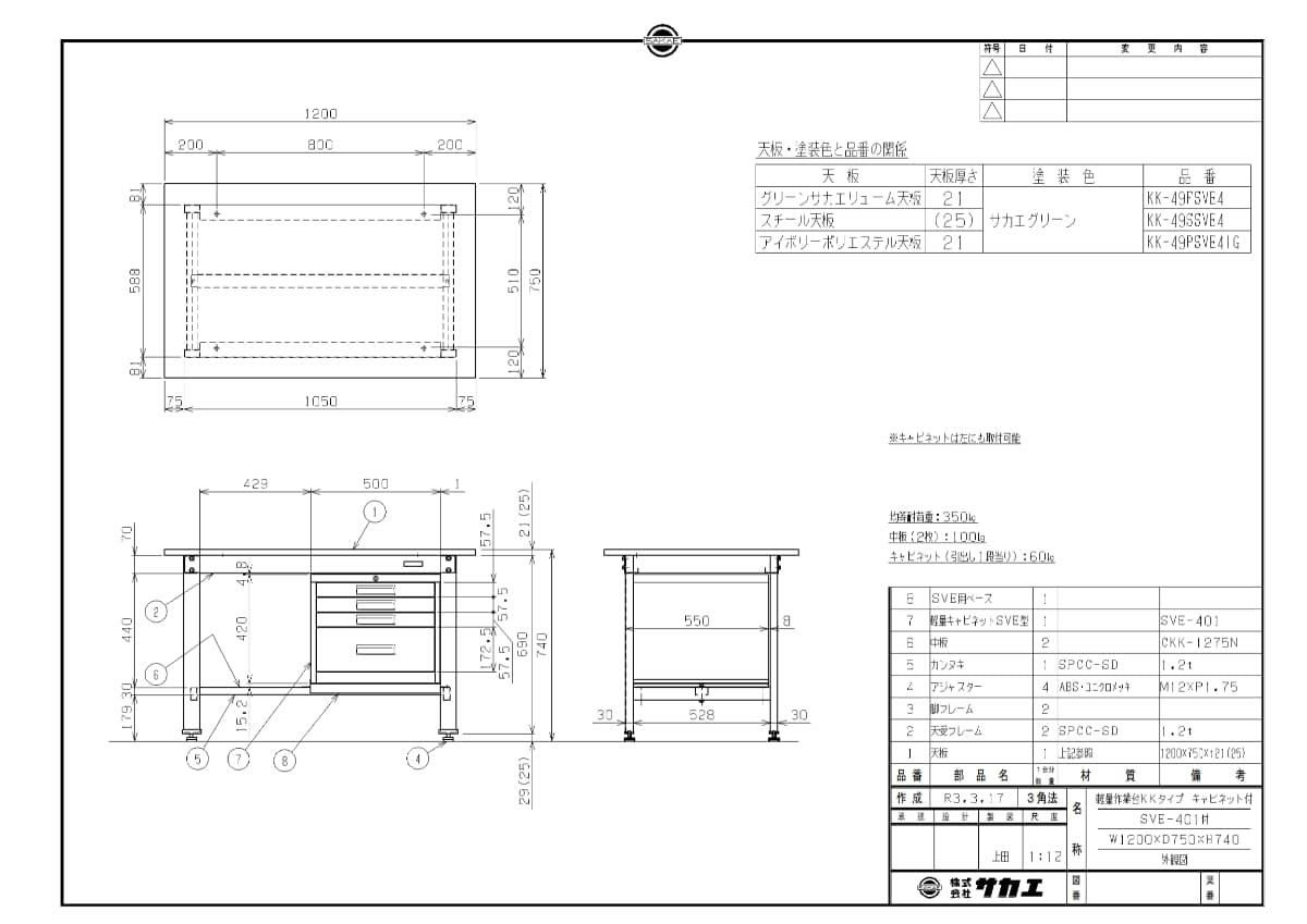 KK-49SSVE4 【サカエ】【固定式】軽量作業台KKタイプ(SVEキャビネット付) 幅1200×奥行750×高さ740mm