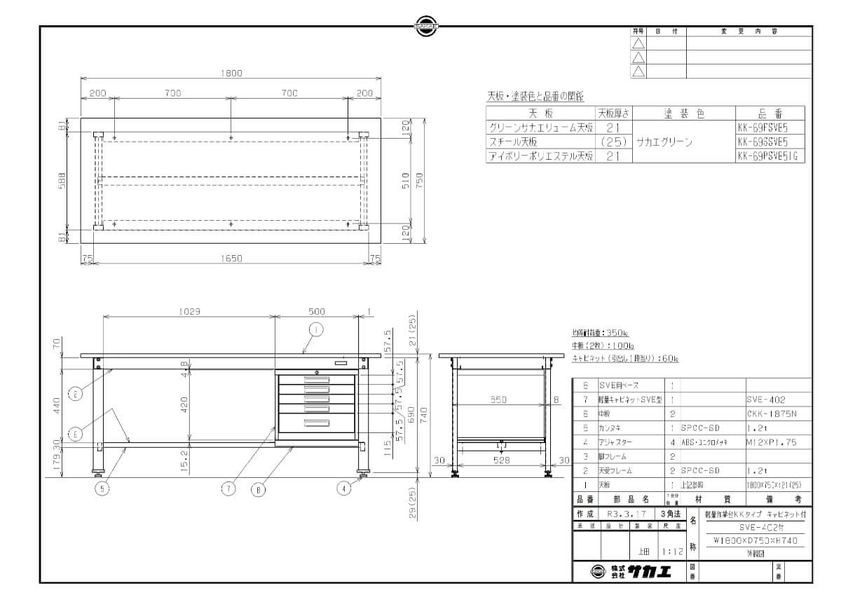 KK-69SSVE5 【サカエ】【固定式】軽量作業台KKタイプ(SVEキャビネット付) 幅1800×奥行750×高さ740mm