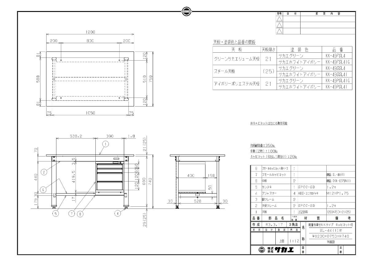KK-49SSL4I 【サカエ】【固定式】軽量作業台KKタイプ(スモールキャビネット付) 幅1200×奥行750×高さ740mm