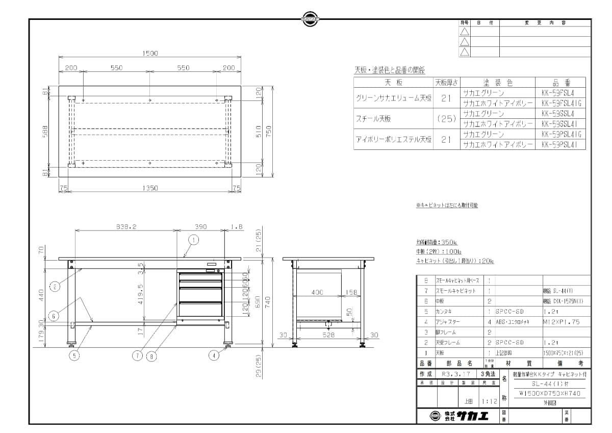 KK-59SSL4I 【サカエ】【固定式】軽量作業台KKタイプ(スモールキャビネット付) 幅1500×奥行750×高さ740mm