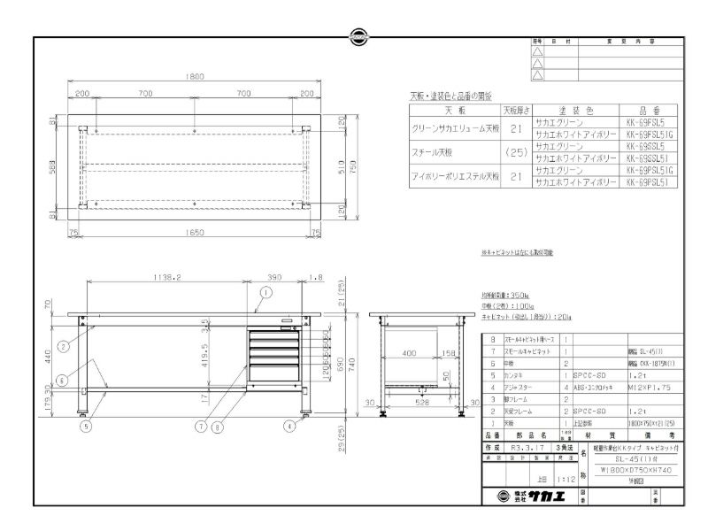KK-69PSL5I 【サカエ】【固定式】軽量作業台KKタイプ(スモールキャビネット付) 幅1800×奥行750×高さ740mm