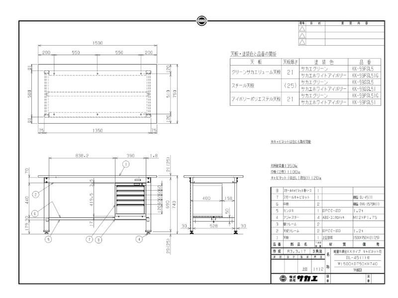 KK-59PSL5IG 【サカエ】【固定式】軽量作業台KKタイプ(スモールキャビネット付) 幅1500×奥行750×高さ740mm