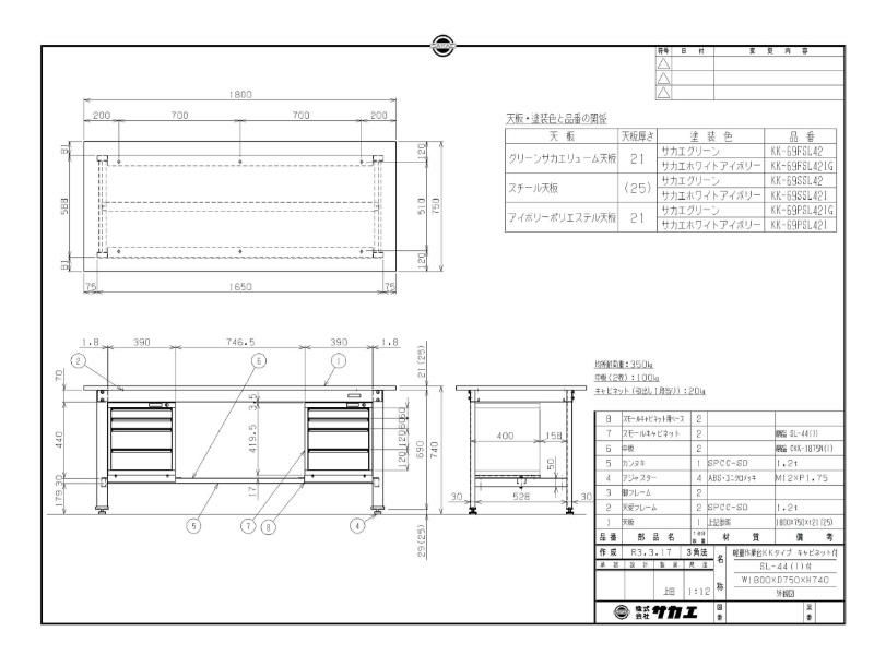KK-69PSL42IG 【サカエ】【固定式】軽量作業台KKタイプ(スモールキャビネット付) 幅1800×奥行750×高さ740mm