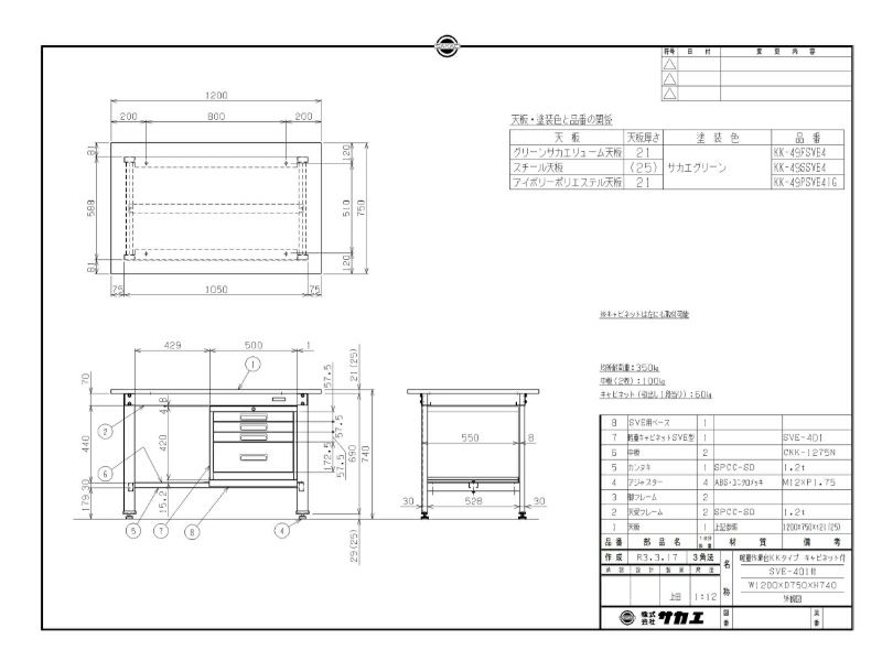 KK-49PSVE4IG 【サカエ】【固定式】軽量作業台KKタイプ(SVEキャビネット付) 幅1200×奥行750×高さ740mm