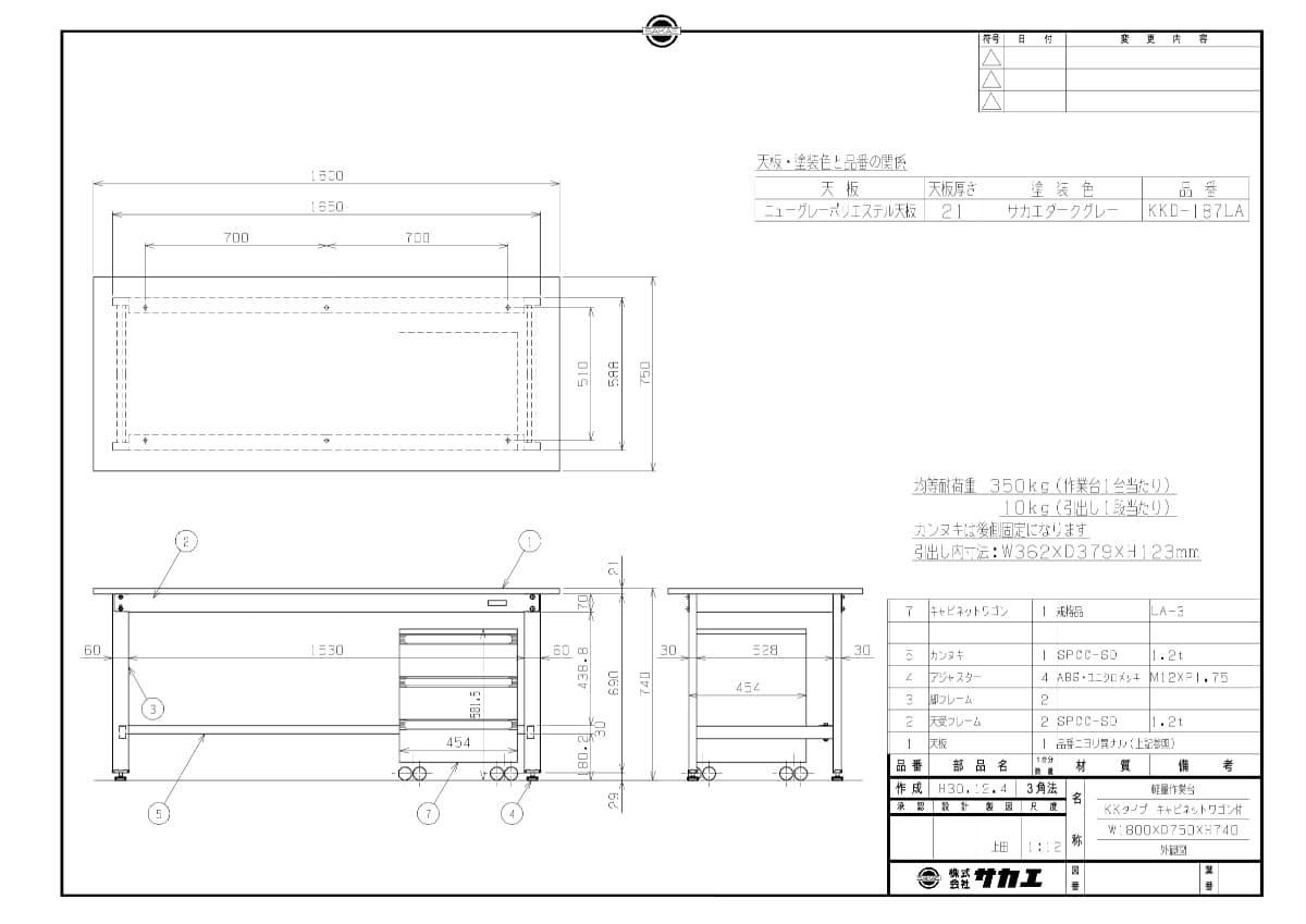 KKD-187LA 【サカエ】【固定式】軽量作業台KKタイプ(キャビネットワゴン付) 幅1800×奥行750×高さ740mm