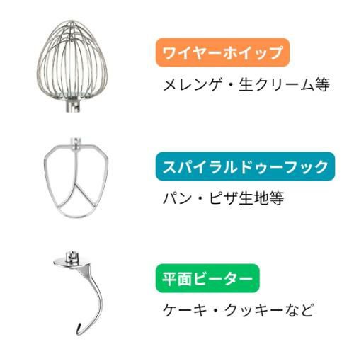 付属品:ボウル,ボウルカバー,ワイヤーホイップ,スパイラルドゥーフック,平面ビーター