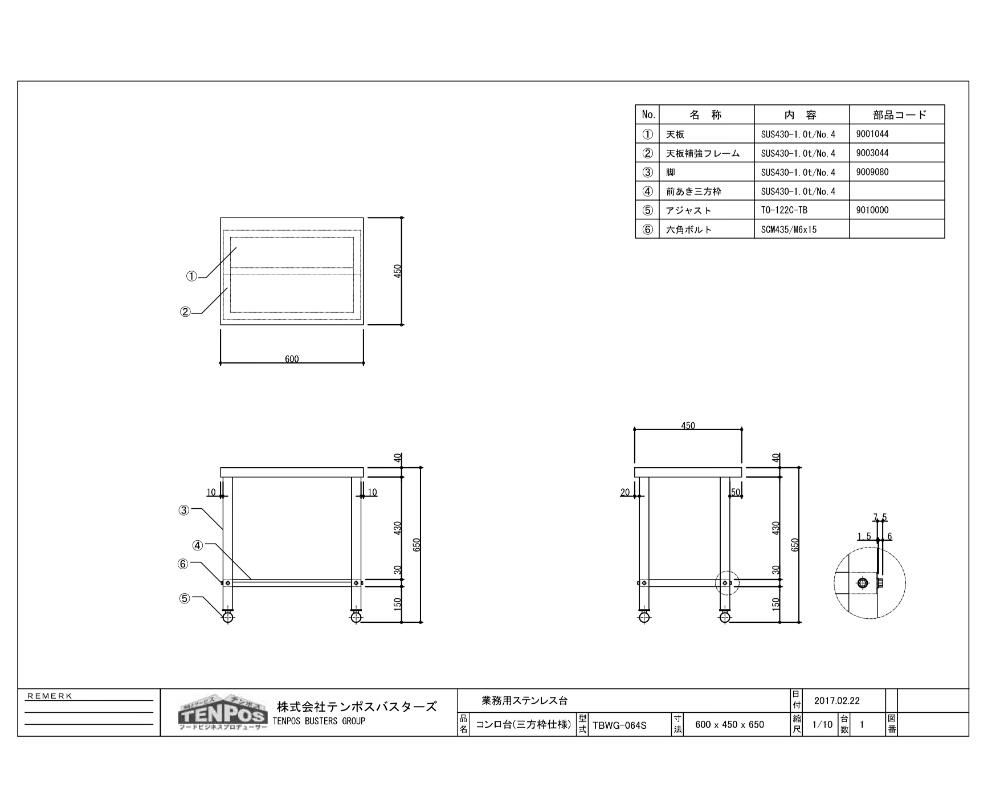 TBWG-064S【テンポスオリジナル】【組立式】三方枠コンロ台/ステンレス作業台 幅600×奥行450×高さ650mm