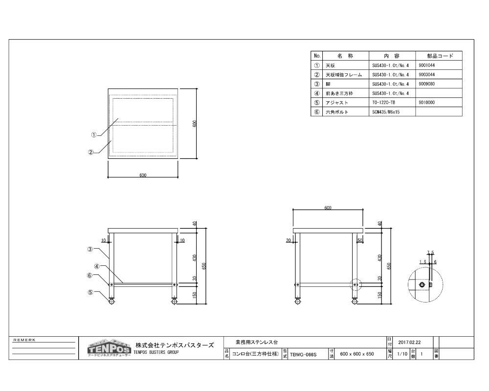 TBWG-066S【テンポスオリジナル】【組立式】三方枠コンロ台/ステンレス作業台 幅600×奥行600×高さ650mm