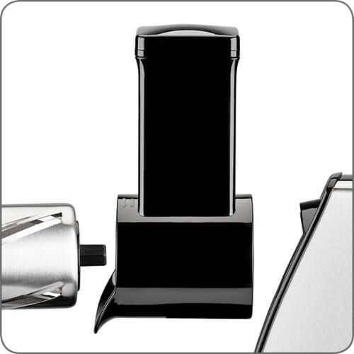 5つのドラムで、スライス、粗切り、すりつぶし、すりおろし、ができる。簡単操作、ドラムを装着して、食材を入れ、プレスするだけ。