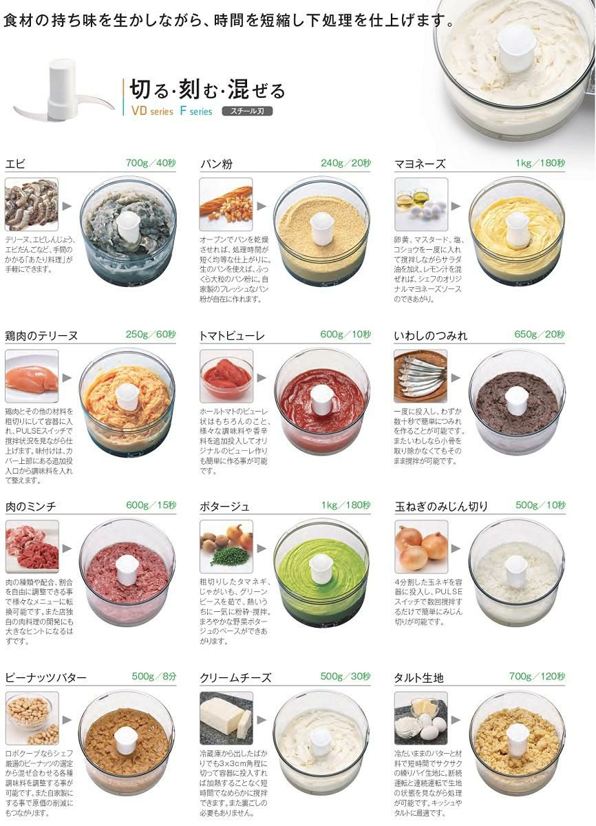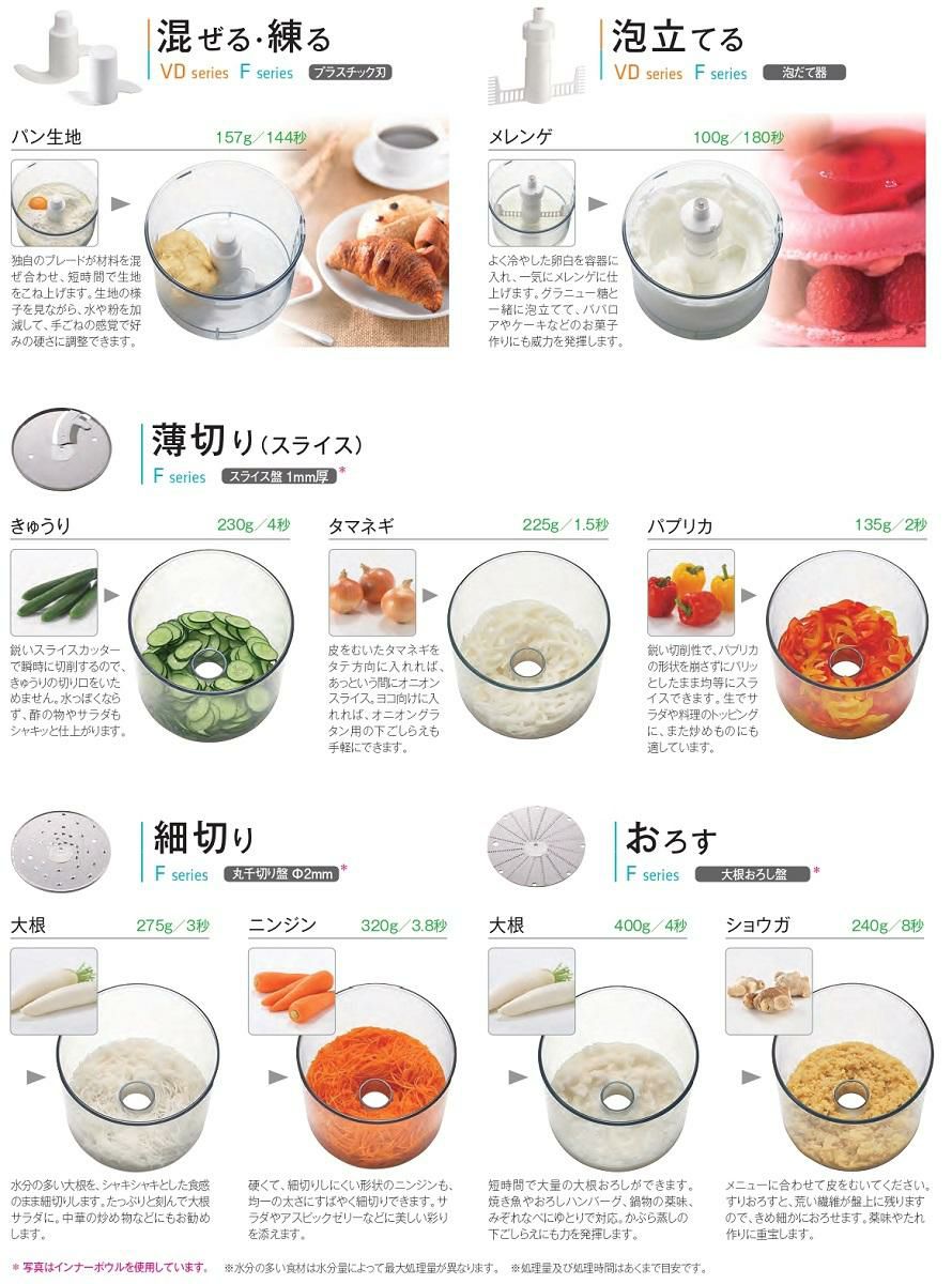 標準付属品:ボウル/ミニボウル(ミニボウル用スチール刃)/ボウルカバー/スチール刃/プラスチック刃/エッグビーター/スパチュラ/ツールボックス/盤取付棒/スライス盤(1mm)/丸千切り盤(径2mm)/大根おろし盤/インナーボウル