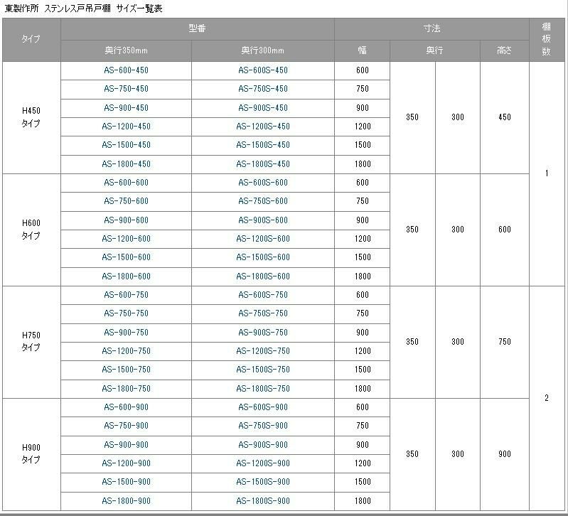 【東製作所】吊戸棚 ステンレス戸 AS-600S-900 幅600×奥行300×高さ900mm