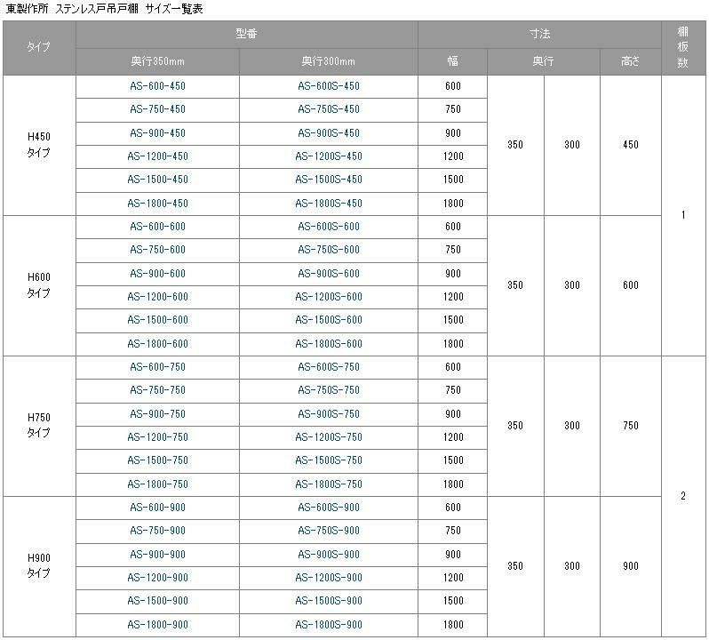 【東製作所】吊戸棚 ステンレス戸 AS-750S-900 幅750×奥行300×高さ900mm