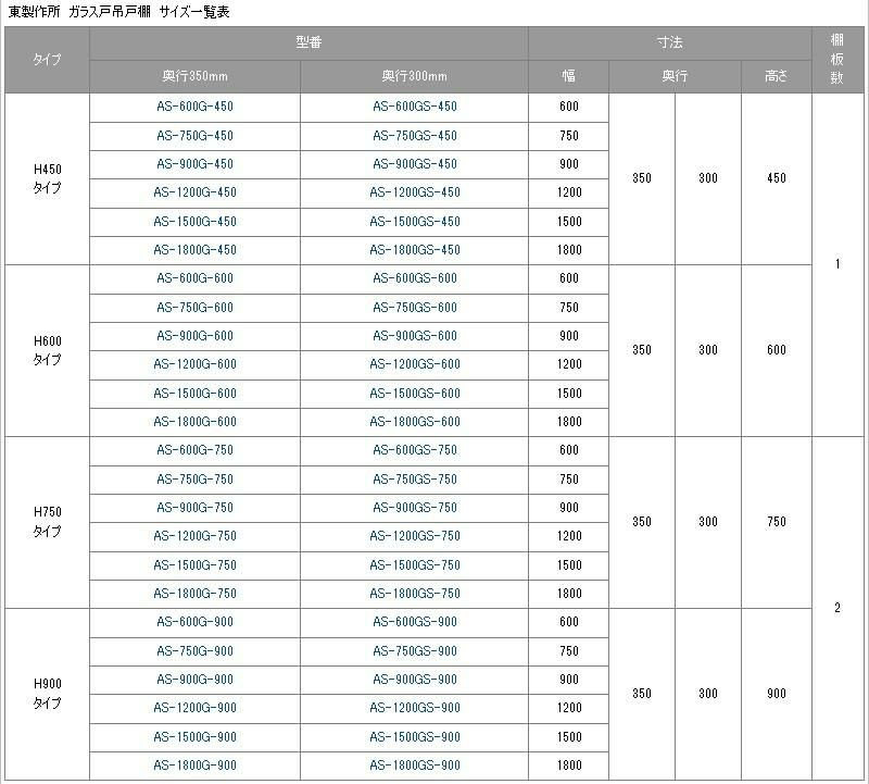 【東製作所】吊戸棚 ガラス戸 AS-750G-600 幅750×奥行350×高さ600mm