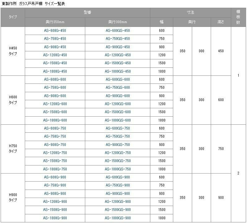 【東製作所】吊戸棚 ガラス戸 AS-750G-750 幅750×奥行350×高さ750mm