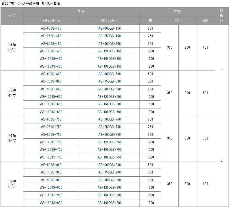 【東製作所】吊戸棚 ガラス戸 AS-600GS-750 幅600×奥行300×高さ750mm