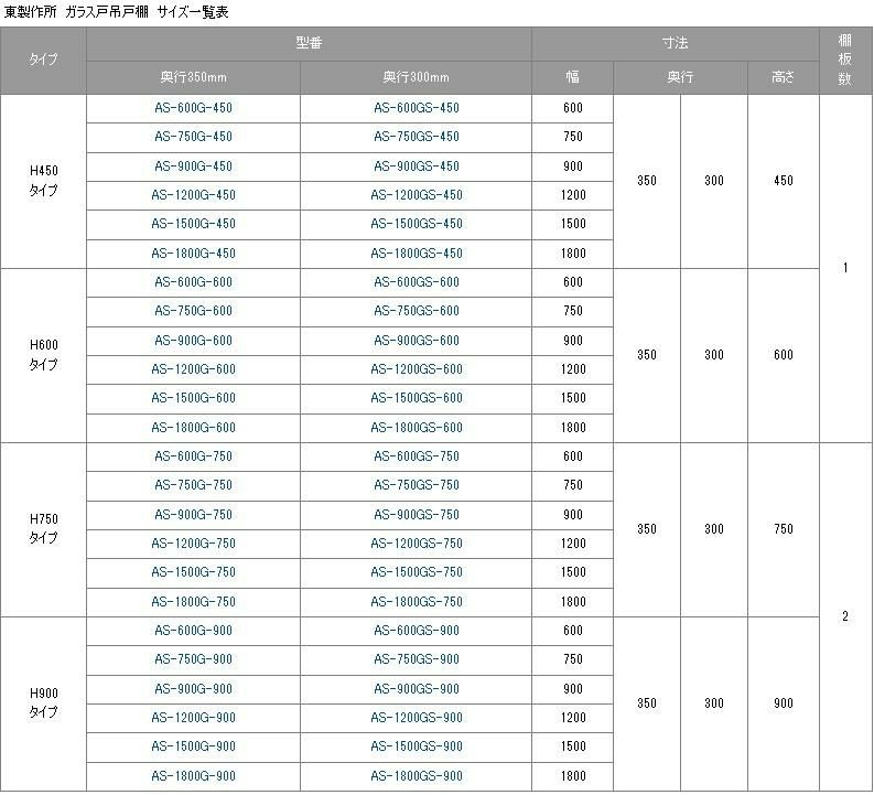 【東製作所】吊戸棚 ガラス戸 AS-750G-900 幅750×奥行350×高さ900mm