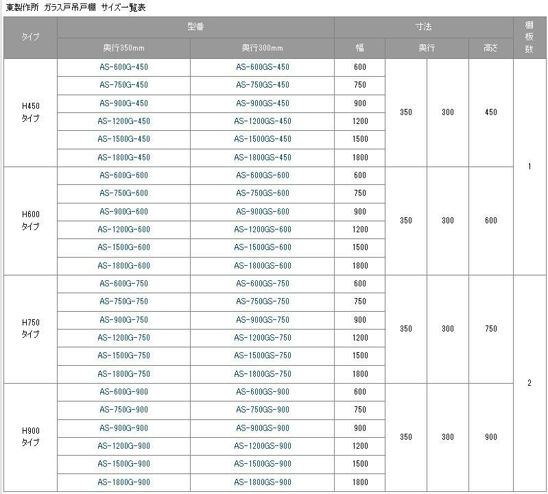 【東製作所】吊戸棚 ガラス戸 AS-750GS-900 幅750×奥行300×高さ900mm