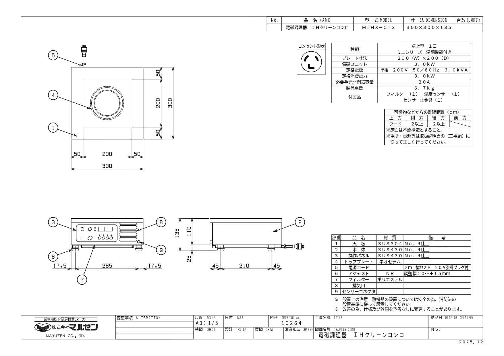 MIHX-CT3 マルゼン IHクリーンコンロ ミニシリーズ 3kw 温度センサー付 幅300×奥行300×高さ135(mm)