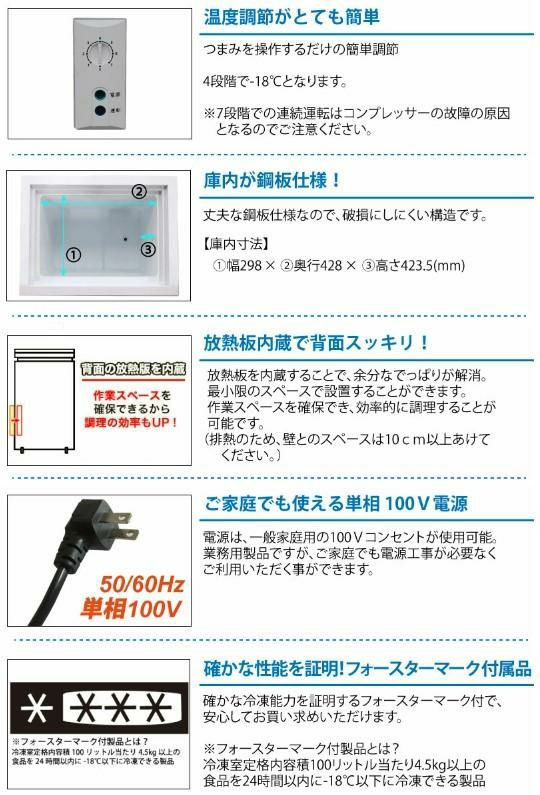 庫内温度:-18度以下(外気温30℃ 無負荷直射日光を受けない状況下)
