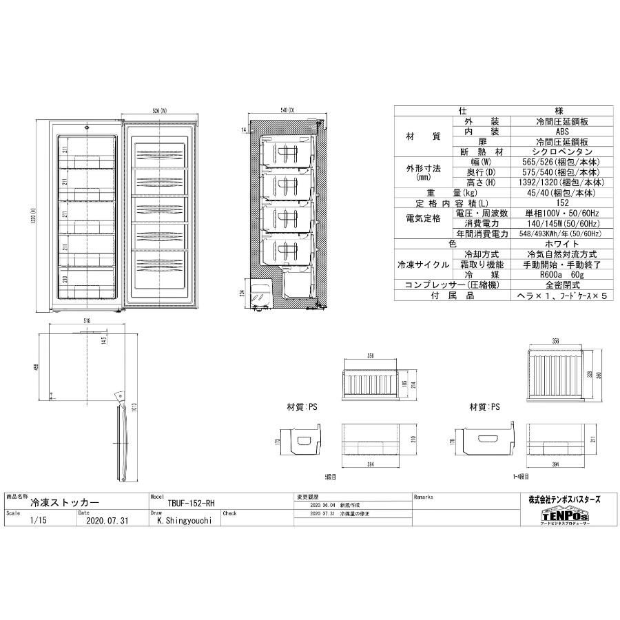 【テンポスオリジナル】TBUF-152-RH冷凍ストッカー 5段 前扉タイプ 152L