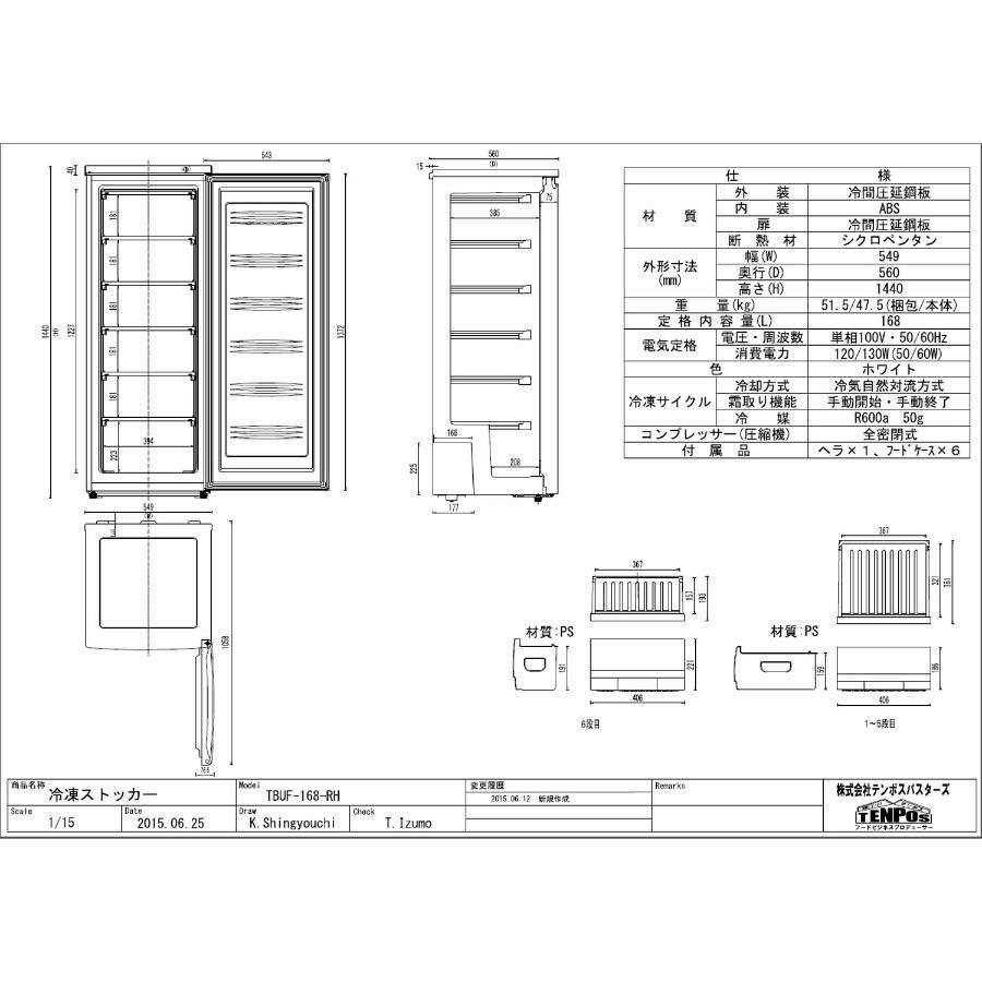 【テンポスオリジナル】TBUF-168-RH 冷凍ストッカー 前扉タイプ 168L