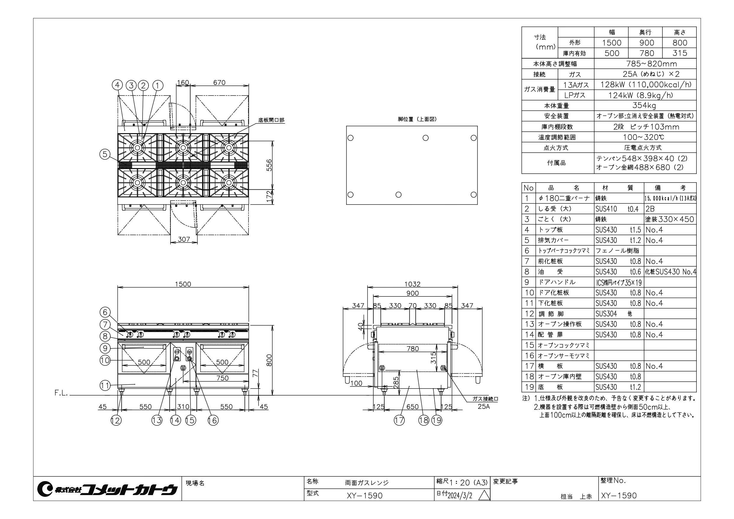 特記事項:トップバーナー個数:2重バーナ 直径180(15,000kcal/h) 2個、2重バーナ 直径180(12,000kcal/h) 4個