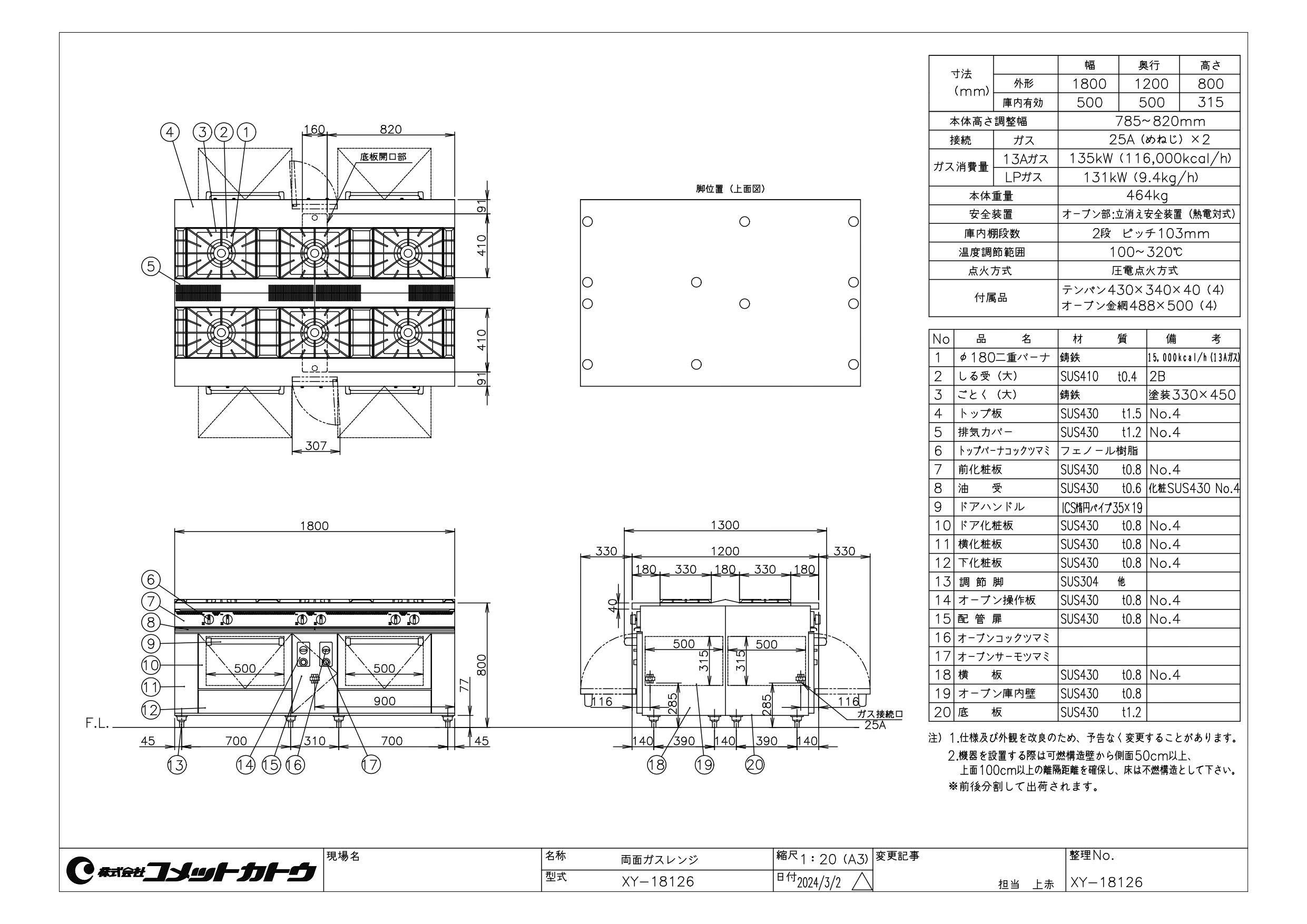 特記事項:トップバーナー個数:2重バーナ 直径180(15,000kcal/h) 6個