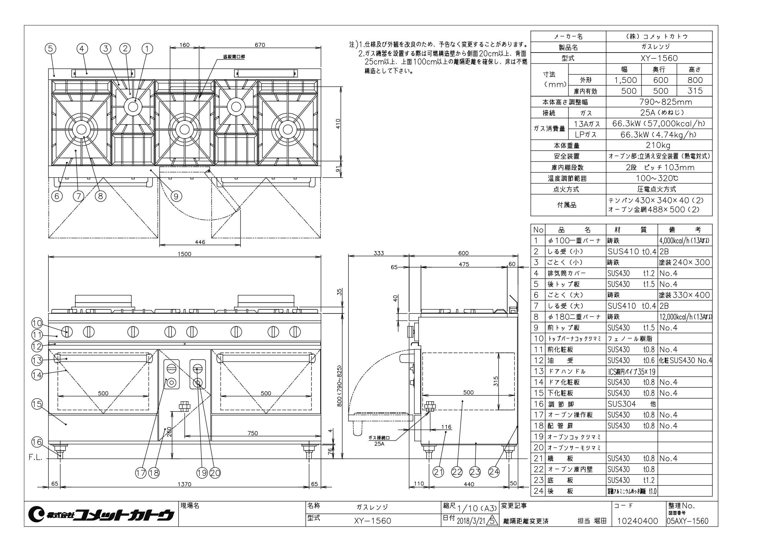 【コメットカトウ】ガスレンジ 5口 XY-1560 幅1500×奥行600×高さ800mm