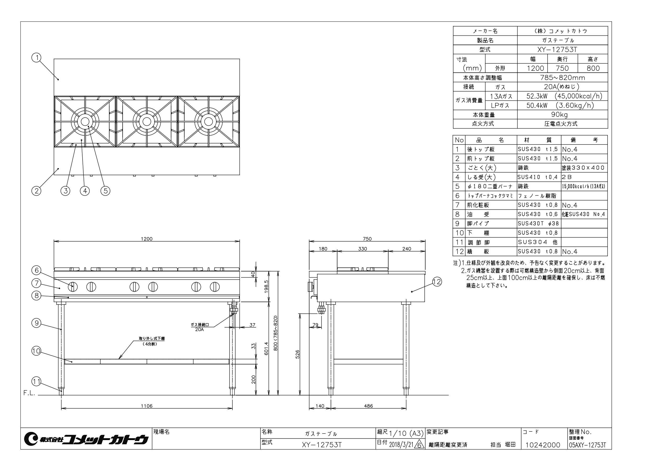 【コメットカトウ】ガステーブル 3口 XY-12753T 幅1200×奥行750×高さ800mm(mm)
