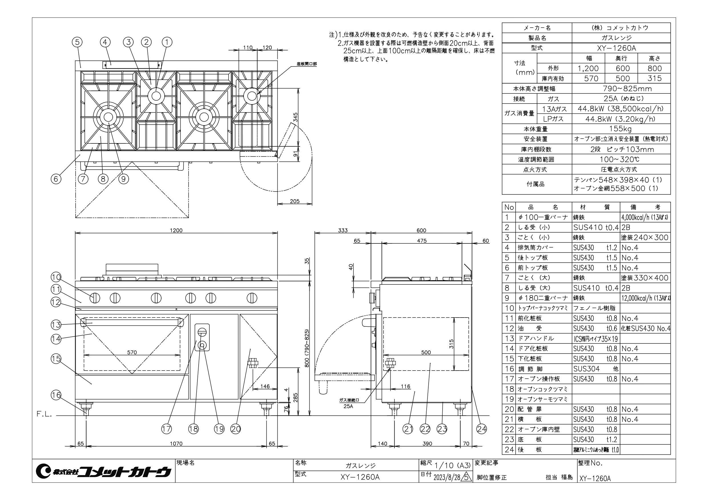 【コメットカトウ】ガスレンジ 4口 XY-1260A 幅1200×奥行600×高さ800mm