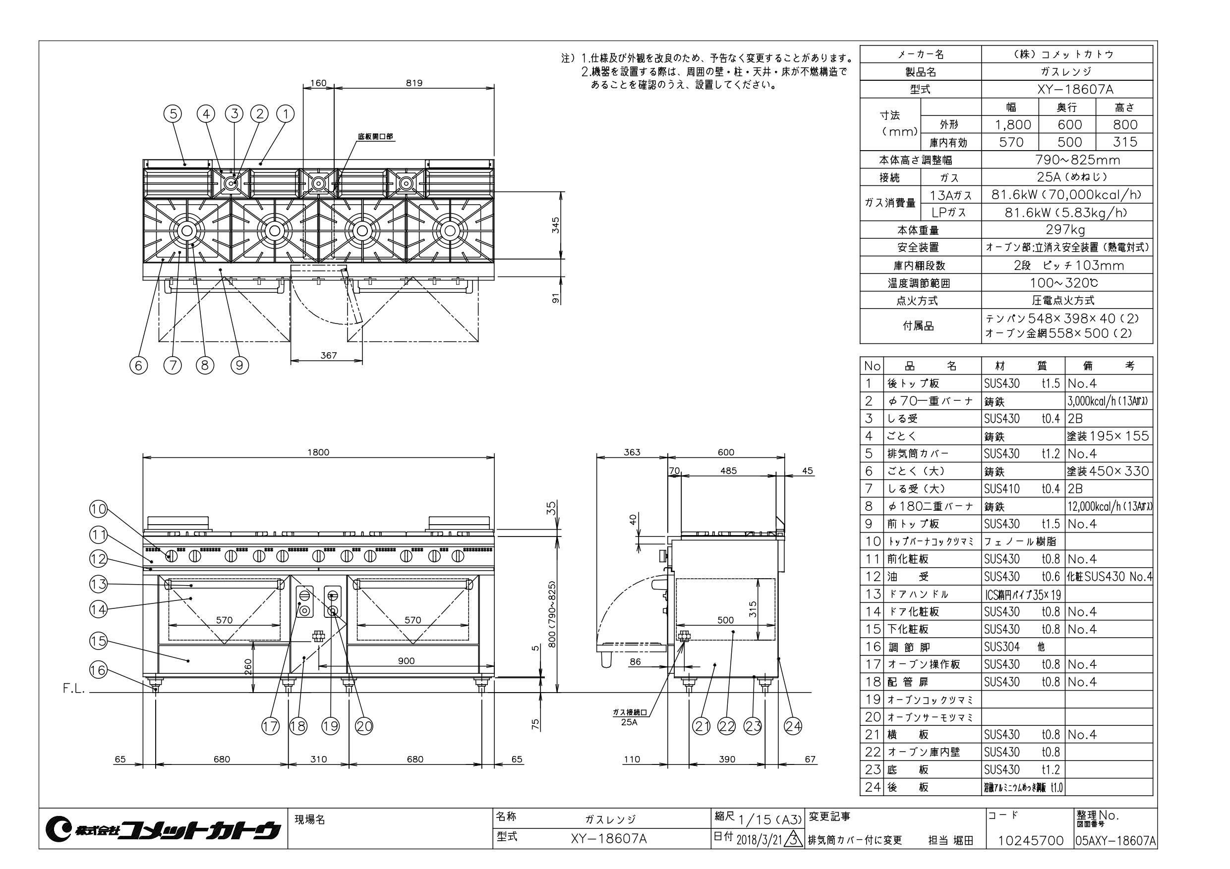 特記事項:トップバーナー個数:2重バーナ 直径180(12,000kcal/h) 4個、1重バーナ 直径100(4,000kcal/h) 3個