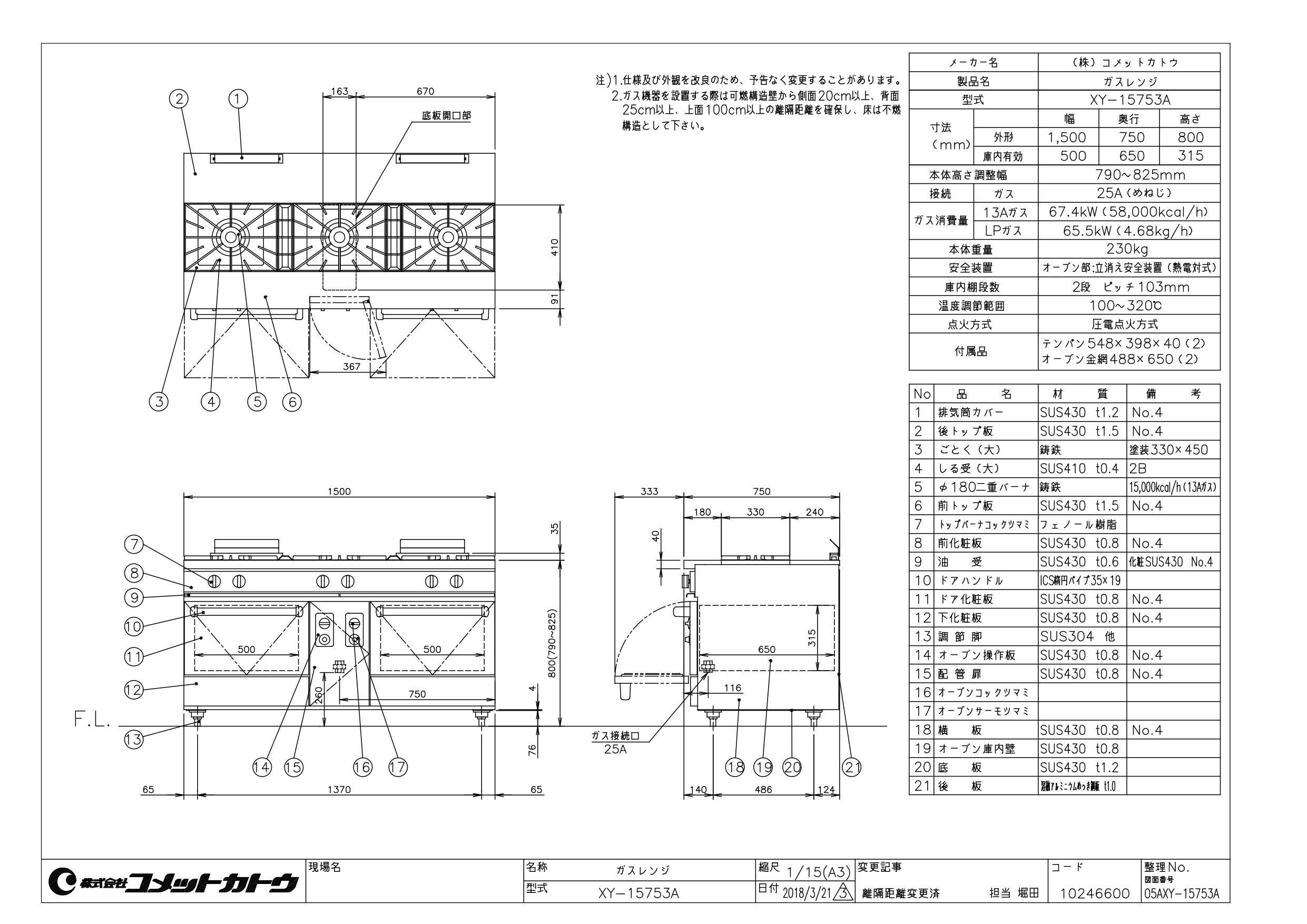 特記事項:トップバーナー個数:2重バーナ 直径180(15,000kcal/h) 3個